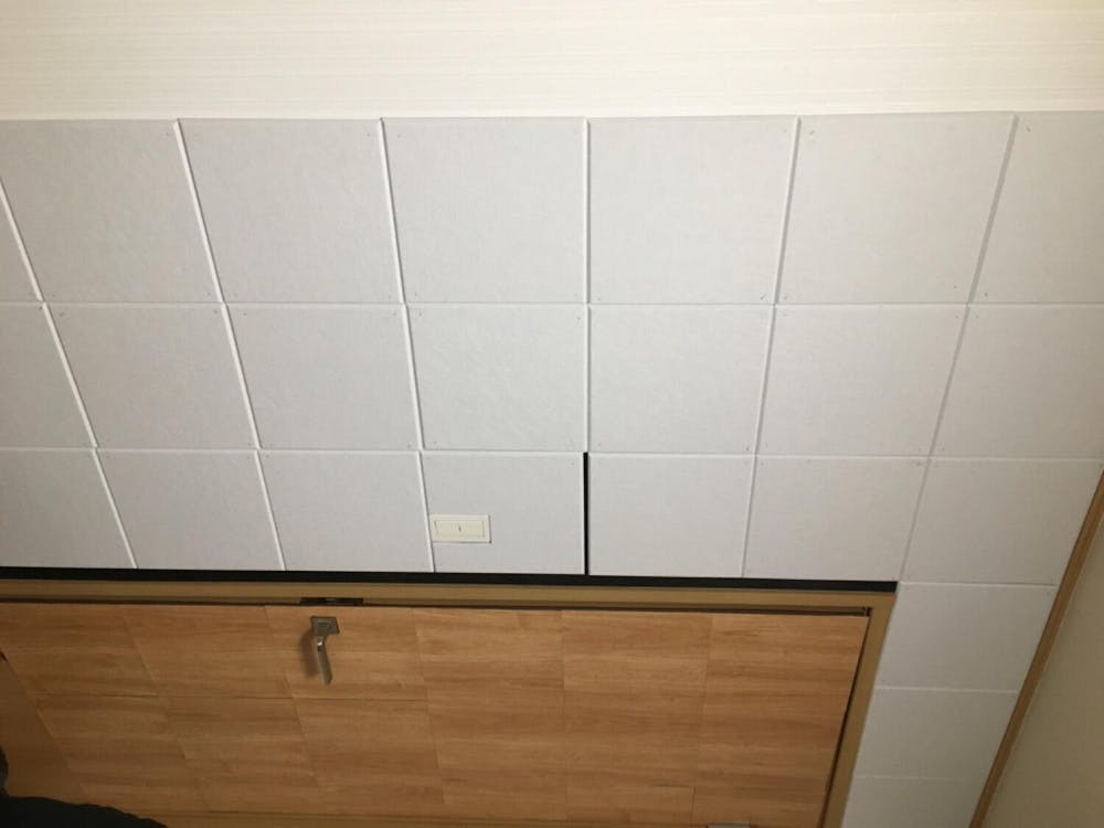 端っこだけ落ちやすかったので、吸音パネルに布ガムテープを貼ってツルツルにしてから両面テープに押し付けるように貼ったら大丈夫でした。