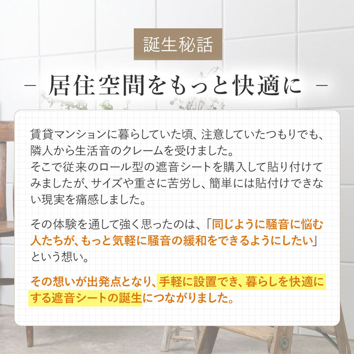 【 約3倍の遮音性 】 さらに防音効果を求める方へ「遮音シートPRO」誕生。「通常版1.2mm厚」より約3倍の遮音性能。一般の石膏ボードと同等の遮音性がありますので、まるで壁を追加したような、快適感。 【 500gの手軽な重量感 】 重さは1枚500mgのペットボトルと同じ。難なく持てる重量感。女性や年配の方でも問題なく持てて、防音対策にチャレンジできます。貼り付けが難しい天井でも、一枚ずつ持てるので取付楽々。 【 日本製という安心性 】 日本製の確かな品質。品質にムラがなく高クオリティ。カット精度も高く、貼り合わせ時にシートの隙間ができません。そして特定の周波数で遮音性能が落ち込む現象(コインシデンス効果)はなく、電波障害(無線LANや携帯電話の不通)もありません。 【 気になる臭いも低減 】 シート独特の気になるイヤな臭いも対策しています。部屋など屋内に貼るからこそ、なるべく無臭を目指し生産しています。 【 体に害がない安心素材 】 素材は高比重物質配合軟質塩ビ樹脂シートを採用。ホルムアルデヒド告示対象外製品で、ホルムアルデヒドの発散がほとんどありません。そのためシックハウス症候群を引き起こす心配がなく、小さな子供がいるお部屋でも、安心してご使用できます。 【 かんたん取付可能 】 貼り付け方法はタッカーや虫ピン、超強力両面テープなどで壁や天井、床に貼り付けることで固定され、隣接する部屋や外部からの騒音を減少することができます。また、室内の音が漏れるのを減少することも可能です。 【 様々な用途で活躍 】 弊社別売りの吸音材と合わせることで効率的な防音対策や騒音対策が可能です。簡易防音室・防音ブース・アパートの防音壁・子供部屋の壁用など様々な用途で利用できます。 【 柔らかい素材で容易な加工性 】3mm厚も柔らかい素材でエアコンやコンプレッサーなど湾曲しているものへの貼り付け可能。さらにハサミやカッターで無理なく、自由にカットでき、設置場所に合わせてきれいに加工可能です。 【 処分もスマートに 】 もし不要になった場合は家庭用ゴミ袋でサッとまとめられます。従来のロール型のように粗大ごみで出す必要がなく、コンパクトに処分できるため急な引越しでも安心です。 【 ご注意 】 取付には別途両面テープ、タッカーなどが必要となります。 |