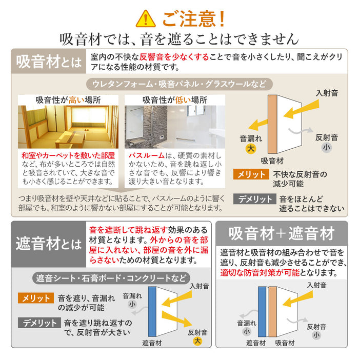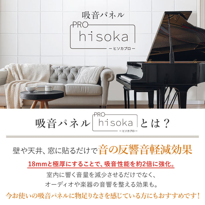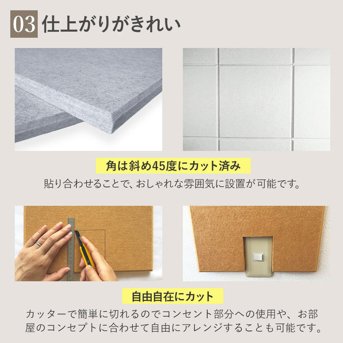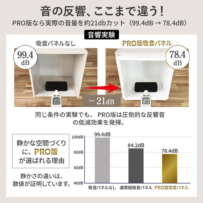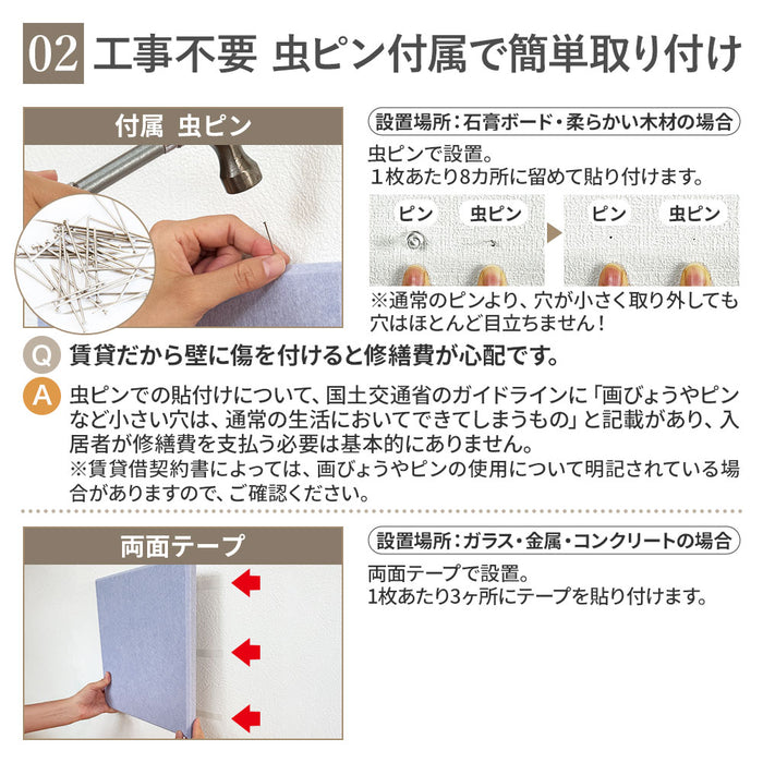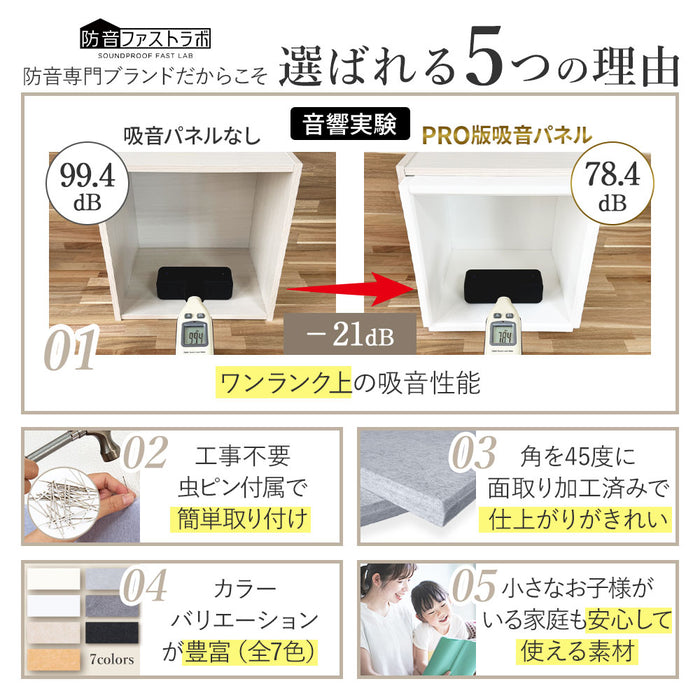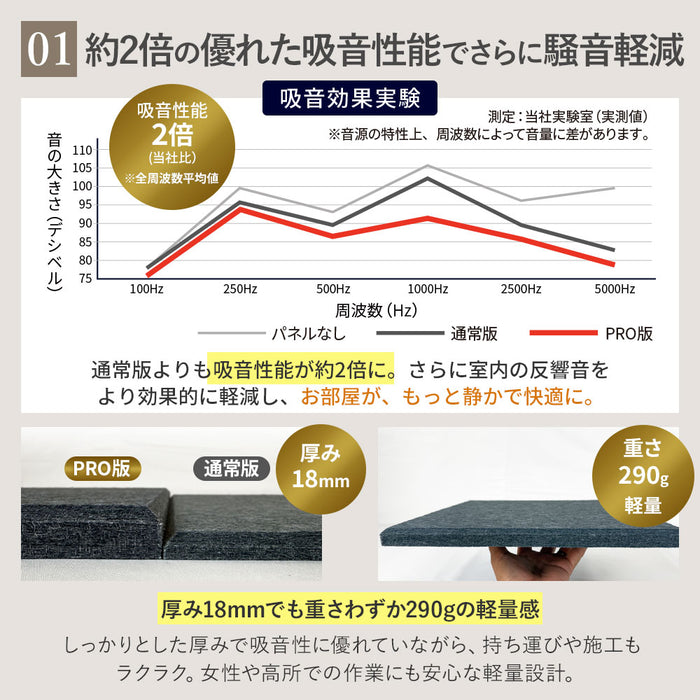 【 PRO仕様の音響・騒音対策。防音ブースや楽器練習室などにも 】 壁や天井に貼り付けるだけで音響対策になる吸音パネルPROは、従来の9mm厚タイプと比較して、厚みを18mmに増すことで、より高い吸音性能を発揮。室内に響く不快な反響音をさらに効果的に抑え、音声や音楽をよりクリアに聴くことができます。密度180kg/m³の高密度吸音素材を使用し、分厚いウレタンフォーム素材以上の吸音効果を実現しながら、ニオイもなく、快適な空間づくりに貢献。 防音ブースや簡易防音室、楽器の練習環境、リモートワーク用の防音対策にも最適です。さらに、変色性がないため、豊富なカラーバリエーションを壁紙感覚で楽しむことができ、機能性とデザイン性の両立が可能です。 【 軽量で簡単綺麗に貼りつけ可能 】 100%ポリエステル素材を採用した防音パネルは、1枚当たり270gなので手軽に貼り付けることができる設計により、広い壁にも綺麗に貼り付けることが可能です。角を斜め45度にカットされているため、隙間無く美しく貼り付けることができます。 【 虫ピン付属で簡単貼り付け 】貼り付け方法はとても簡単。付属の虫ピンを打ち付けることで、壁や天井にしっかりと固定されます。痕が目立ちにくい虫ピンは、取り外しもスムーズに行えるのでちょっとした模様替えにもおすすめです。別売りの両面テープをマスキングテープの上から貼りつければ、虫ピンを利用せず綺麗に貼りつけることも可能です。 【 断熱にも効果を発揮 】 吸音パネルによる断熱性で暑い日は屋内の温度が上昇するのを防ぎは涼しく、寒い日には冷気から屋内を守り暖かくお過ごしいただけます。当社実験では冷房効果40.3%、暖房効果54.0%効果がUPされました。 【 安心・安全の素材 】 体に害のあるホルムアルデヒドを放出しない低ホルム商品。難燃性加工により燃えにくく、嫌な臭いもしない安全性にも配慮した安心の商品です。小さなお子様がいるご家庭やキッチン周りでも安心してお使いいただけます。 【 自由自在にカット 】 高密度で高く硬質ですが、カッターで簡単にカットできますのでコンセント部分への使用や、お部屋のコンセプトに合わせて自由にアレンジすることも可能です。汚れが気になる場合は一部のパネルのみ外し、水洗いできるのでメンテナンス簡単です。 【 ご注意 】 こちらの製品は音の反射を吸収する「吸音材」です。音をさえぎる「遮音材」ではございません。遮音が必要な場合、石膏ボード、合板、遮音シートなどと合わせてご利用することで、遮音と吸音を合わせたしっかりとした「防音」を作ることができます。 |