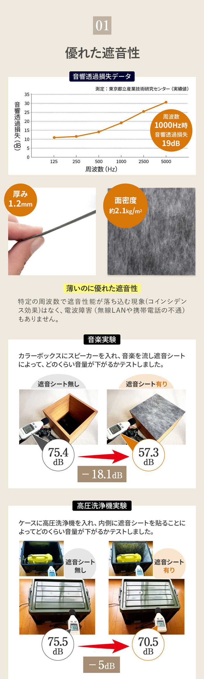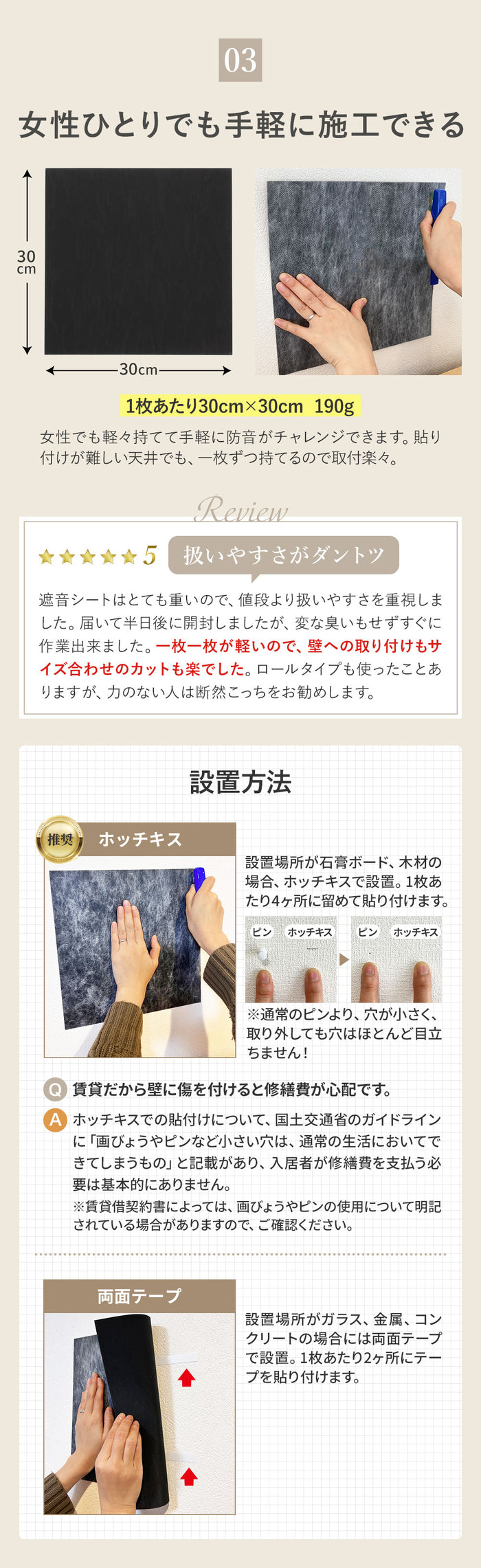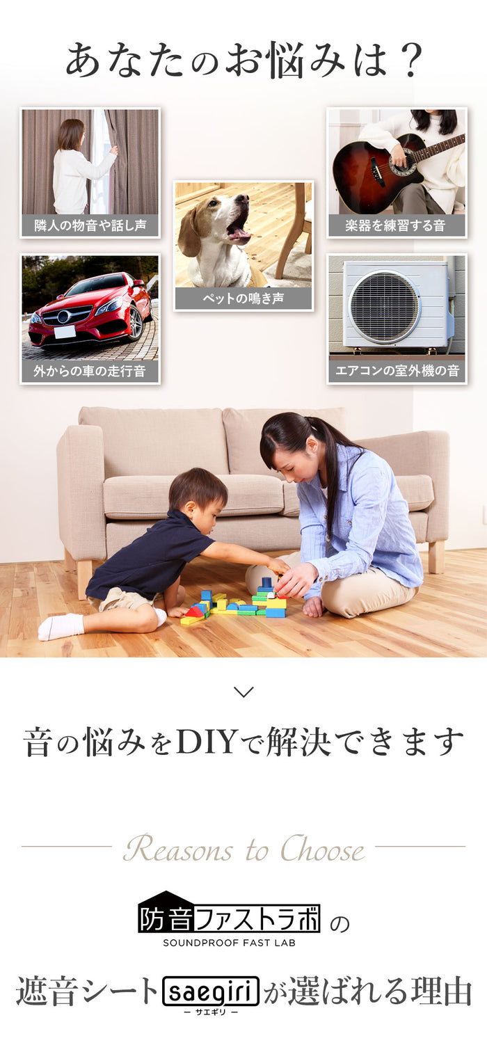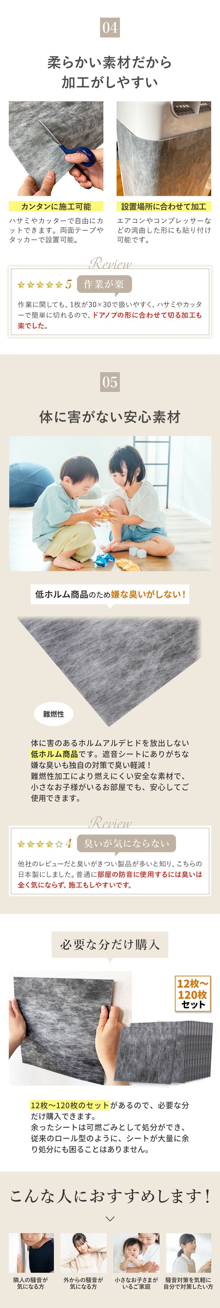 | 【 手軽サイズの遮音シート 】 多くのお客様からご要望いただいていた、手軽サイズ30cm×30cmの防音シート。1枚当たりわずか190g、12枚セットで柔軟な配置が可能です。片手で持ってスムーズな取付ができ、ちょっと使いにも最適で、必要な分だけ購入が可能。従来のロール型のように移動や取付に一苦労、余ったシートが半年放置ということもありません。 【 日本製で優れた遮音性 】 日本製の確かな品質をお約束いたします。品質やカットサイズにムラがなく高クオリティ。厚み1.2mm 面密度 約2.1kg/m3で周波数1000Hz時の音響透過損失19dBと実績ある遮音性能。特定の周波数で遮音性能が落ち込む現象(コインシデンス効果)はなく、電波障害(無線LANや携帯電話の不通)もありません。 【 使いやすいサイズと軽量感 】 30cm×30cmのお手軽サイズで防音ボックス、ピアノやドアなどのちょっと使いたいに最適。厚み1.2mmでパソコンやテレビの裏の狭いスペースでも厚みを気にする必要がありません。1枚が190gなため、女性や年配の方でも軽々持てて、防音対策にチャレンジできます。貼り付けが難しい天井でも、一枚ずつ持てるので取付楽々。 【 体に害がない安心素材 】 素材は高比重物質配合軟質塩ビ樹脂を採用。ホルムアルデヒド告示対象外製品で、ホルムアルデヒドの発散がほとんどありません。そのためシックハウス症候群を引き起こす心配がなく、小さな子供がいるお部屋でも、安心してご使用できます。 【 柔らかい素材で簡単な加工性 】 柔らかい素材でエアコンやコンプレッサーなど湾曲しているものへの貼り付けに対応。さらにハサミやカッターで自由にカットでき、設置場所に合わせてきれいに加工可能です。 【 様々な用途で活躍 】 弊社別売りの吸音材と合わせることで効率的な防音対策や騒音対策が可能です。簡易防音室・防音ブース・アパートの防音壁・子供部屋の壁用・窓の遮音・車のデッドニングなど様々な用途で利用できます。 【 処分もスマートに 】 もし不要になった場合は家庭用ゴミ袋でサッとまとめられます。従来のロール型のように粗大ごみで出す必要がなく、コンパクトに処分できるため急な引越しでも安心です。 【 商品詳細 】 セット内容:遮音シート12枚 素材:高比重物質配合軟質塩ビ樹脂シート/片面不織布貼り(難燃性)サイズ:30cm×30cm 重さ:1枚190g 厚み:1.2mm 面密度:約2.1kg/m3 周波数1000Hz時音響透過損失19dB 【 ご注意 】 取付には別途両面テープ、タッカーなどが必要となります。 |