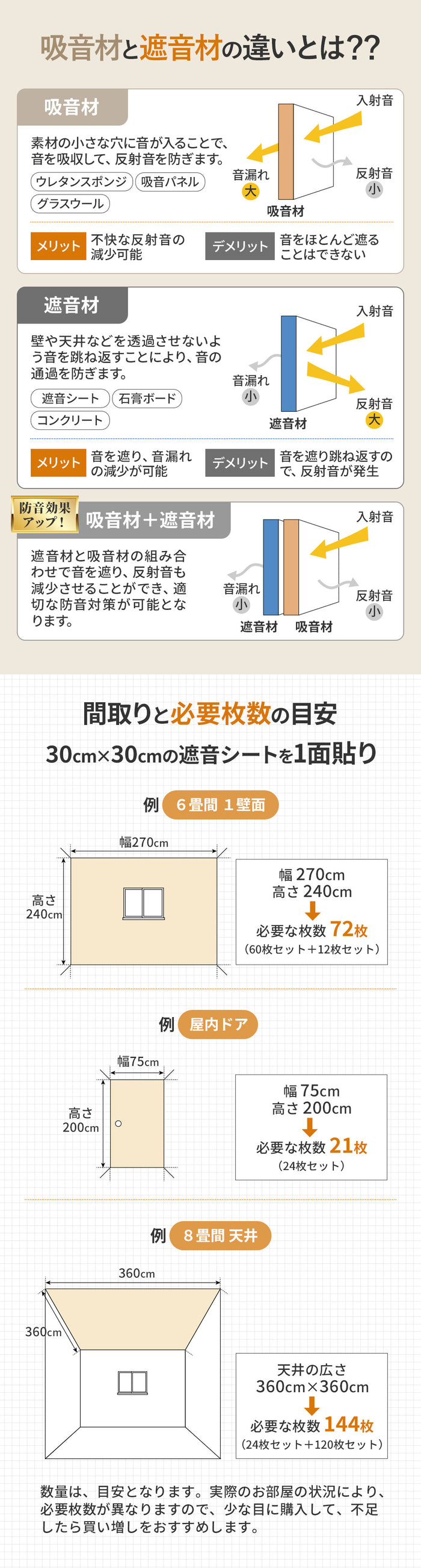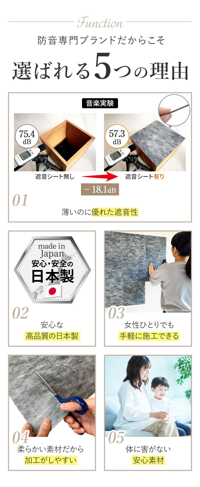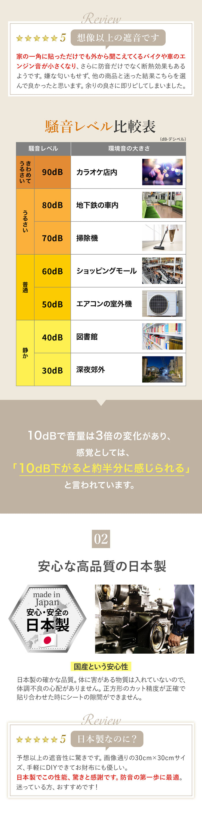 | 【 手軽サイズの遮音シート 】 多くのお客様からご要望いただいていた、手軽サイズ30cm×30cmの防音シート。1枚当たりわずか190g、12枚セットで柔軟な配置が可能です。片手で持ってスムーズな取付ができ、ちょっと使いにも最適で、必要な分だけ購入が可能。従来のロール型のように移動や取付に一苦労、余ったシートが半年放置ということもありません。 【 日本製で優れた遮音性 】 日本製の確かな品質をお約束いたします。品質やカットサイズにムラがなく高クオリティ。厚み1.2mm 面密度 約2.1kg/m3で周波数1000Hz時の音響透過損失19dBと実績ある遮音性能。特定の周波数で遮音性能が落ち込む現象(コインシデンス効果)はなく、電波障害(無線LANや携帯電話の不通)もありません。 【 使いやすいサイズと軽量感 】 30cm×30cmのお手軽サイズで防音ボックス、ピアノやドアなどのちょっと使いたいに最適。厚み1.2mmでパソコンやテレビの裏の狭いスペースでも厚みを気にする必要がありません。1枚が190gなため、女性や年配の方でも軽々持てて、防音対策にチャレンジできます。貼り付けが難しい天井でも、一枚ずつ持てるので取付楽々。 【 体に害がない安心素材 】 素材は高比重物質配合軟質塩ビ樹脂を採用。ホルムアルデヒド告示対象外製品で、ホルムアルデヒドの発散がほとんどありません。そのためシックハウス症候群を引き起こす心配がなく、小さな子供がいるお部屋でも、安心してご使用できます。 【 柔らかい素材で簡単な加工性 】 柔らかい素材でエアコンやコンプレッサーなど湾曲しているものへの貼り付けに対応。さらにハサミやカッターで自由にカットでき、設置場所に合わせてきれいに加工可能です。 【 様々な用途で活躍 】 弊社別売りの吸音材と合わせることで効率的な防音対策や騒音対策が可能です。簡易防音室・防音ブース・アパートの防音壁・子供部屋の壁用・窓の遮音・車のデッドニングなど様々な用途で利用できます。 【 処分もスマートに 】 もし不要になった場合は家庭用ゴミ袋でサッとまとめられます。従来のロール型のように粗大ごみで出す必要がなく、コンパクトに処分できるため急な引越しでも安心です。 【 商品詳細 】 セット内容:遮音シート12枚 素材:高比重物質配合軟質塩ビ樹脂シート/片面不織布貼り(難燃性)サイズ:30cm×30cm 重さ:1枚190g 厚み:1.2mm 面密度:約2.1kg/m3 周波数1000Hz時音響透過損失19dB 【 ご注意 】 取付には別途両面テープ、タッカーなどが必要となります。 |