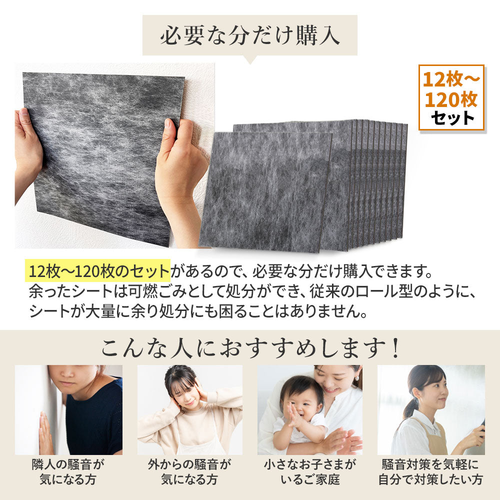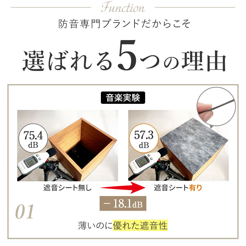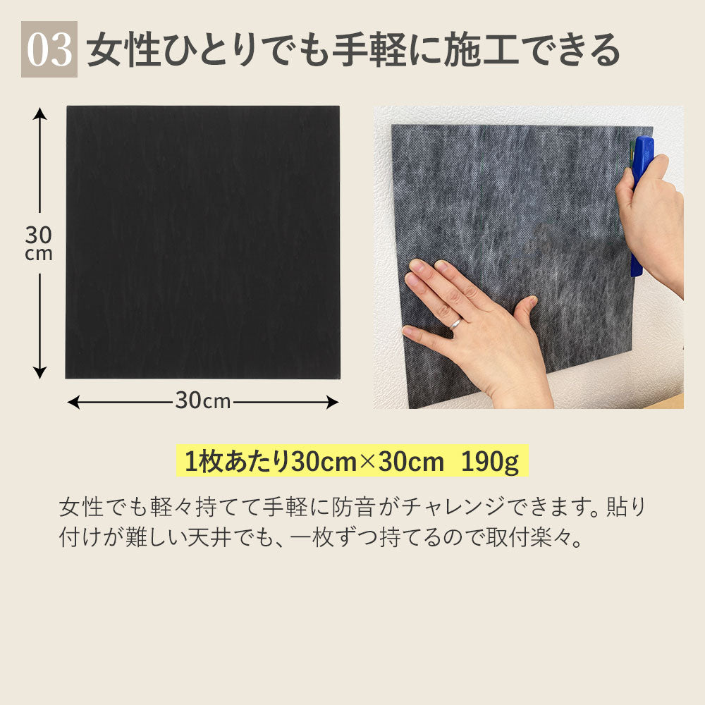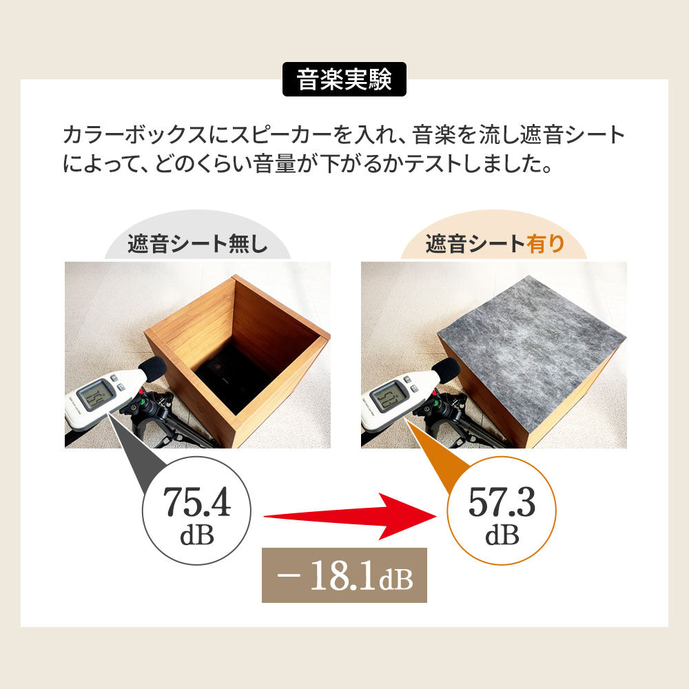 | 【 手軽サイズの遮音シート 】 多くのお客様からご要望いただいていた、手軽サイズ30cm×30cmの防音シート。1枚当たりわずか190g、12枚セットで柔軟な配置が可能です。片手で持ってスムーズな取付ができ、ちょっと使いにも最適で、必要な分だけ購入が可能。従来のロール型のように移動や取付に一苦労、余ったシートが半年放置ということもありません。 【 日本製で優れた遮音性 】 日本製の確かな品質をお約束いたします。品質やカットサイズにムラがなく高クオリティ。厚み1.2mm 面密度 約2.1kg/m3で周波数1000Hz時の音響透過損失19dBと実績ある遮音性能。特定の周波数で遮音性能が落ち込む現象(コインシデンス効果)はなく、電波障害(無線LANや携帯電話の不通)もありません。 【 使いやすいサイズと軽量感 】 30cm×30cmのお手軽サイズで防音ボックス、ピアノやドアなどのちょっと使いたいに最適。厚み1.2mmでパソコンやテレビの裏の狭いスペースでも厚みを気にする必要がありません。1枚が190gなため、女性や年配の方でも軽々持てて、防音対策にチャレンジできます。貼り付けが難しい天井でも、一枚ずつ持てるので取付楽々。 【 体に害がない安心素材 】 素材は高比重物質配合軟質塩ビ樹脂を採用。ホルムアルデヒド告示対象外製品で、ホルムアルデヒドの発散がほとんどありません。そのためシックハウス症候群を引き起こす心配がなく、小さな子供がいるお部屋でも、安心してご使用できます。 【 柔らかい素材で簡単な加工性 】 柔らかい素材でエアコンやコンプレッサーなど湾曲しているものへの貼り付けに対応。さらにハサミやカッターで自由にカットでき、設置場所に合わせてきれいに加工可能です。 【 様々な用途で活躍 】 弊社別売りの吸音材と合わせることで効率的な防音対策や騒音対策が可能です。簡易防音室・防音ブース・アパートの防音壁・子供部屋の壁用・窓の遮音・車のデッドニングなど様々な用途で利用できます。 【 処分もスマートに 】 もし不要になった場合は家庭用ゴミ袋でサッとまとめられます。従来のロール型のように粗大ごみで出す必要がなく、コンパクトに処分できるため急な引越しでも安心です。 【 商品詳細 】 セット内容:遮音シート12枚 素材:高比重物質配合軟質塩ビ樹脂シート/片面不織布貼り(難燃性)サイズ:30cm×30cm 重さ:1枚190g 厚み:1.2mm 面密度:約2.1kg/m3 周波数1000Hz時音響透過損失19dB 【 ご注意 】 取付には別途両面テープ、タッカーなどが必要となります。 |