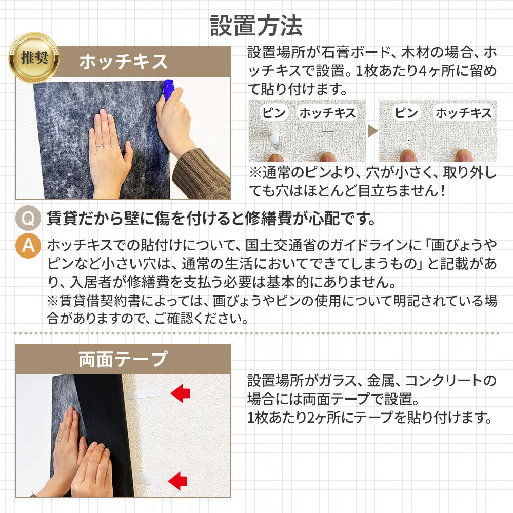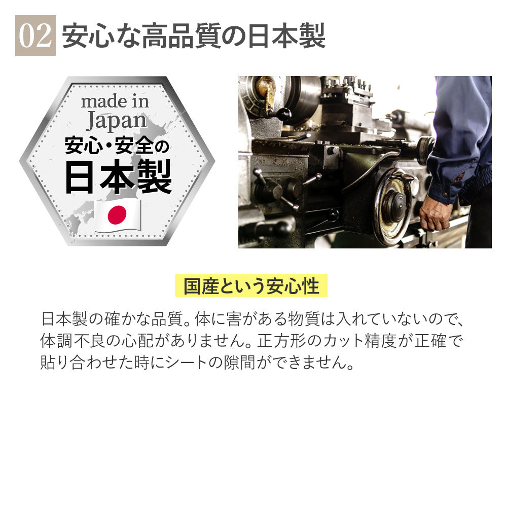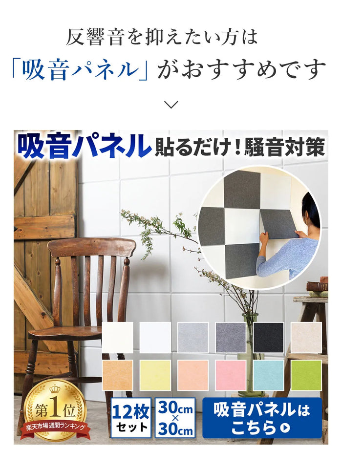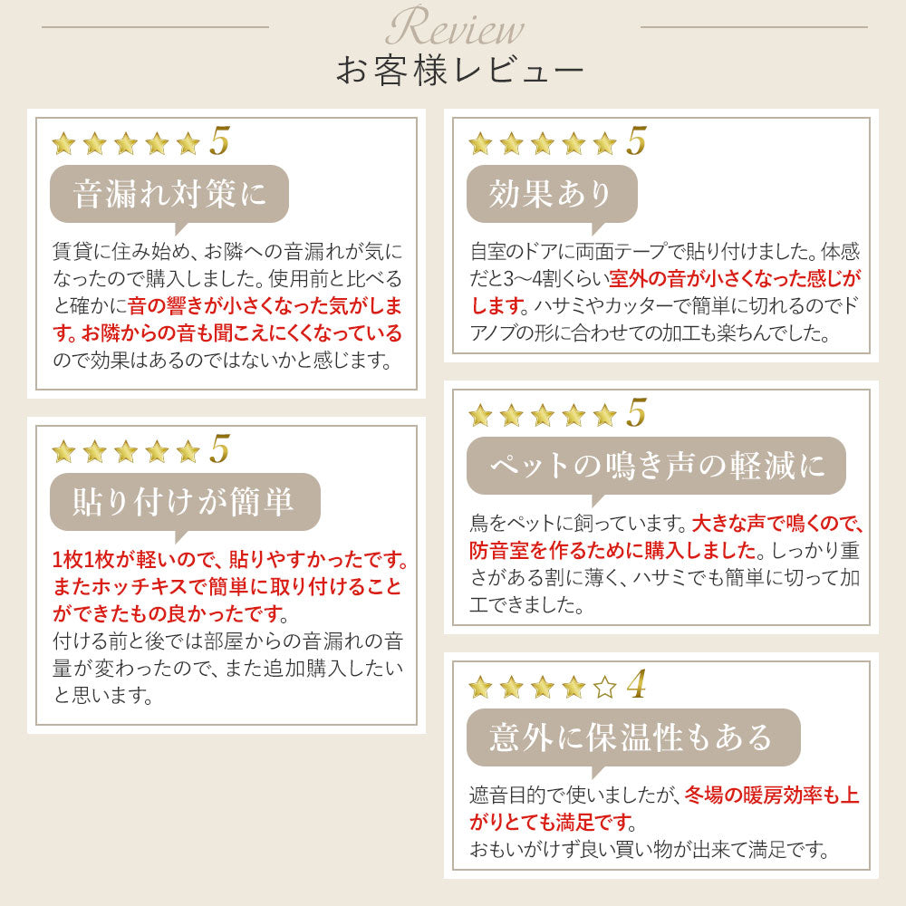 | 【 手軽サイズの遮音シート 】 多くのお客様からご要望いただいていた、手軽サイズ30cm×30cmの防音シート。1枚当たりわずか190g、12枚セットで柔軟な配置が可能です。片手で持ってスムーズな取付ができ、ちょっと使いにも最適で、必要な分だけ購入が可能。従来のロール型のように移動や取付に一苦労、余ったシートが半年放置ということもありません。 【 日本製で優れた遮音性 】 日本製の確かな品質をお約束いたします。品質やカットサイズにムラがなく高クオリティ。厚み1.2mm 面密度 約2.1kg/m3で周波数1000Hz時の音響透過損失19dBと実績ある遮音性能。特定の周波数で遮音性能が落ち込む現象(コインシデンス効果)はなく、電波障害(無線LANや携帯電話の不通)もありません。 【 使いやすいサイズと軽量感 】 30cm×30cmのお手軽サイズで防音ボックス、ピアノやドアなどのちょっと使いたいに最適。厚み1.2mmでパソコンやテレビの裏の狭いスペースでも厚みを気にする必要がありません。1枚が190gなため、女性や年配の方でも軽々持てて、防音対策にチャレンジできます。貼り付けが難しい天井でも、一枚ずつ持てるので取付楽々。 【 体に害がない安心素材 】 素材は高比重物質配合軟質塩ビ樹脂を採用。ホルムアルデヒド告示対象外製品で、ホルムアルデヒドの発散がほとんどありません。そのためシックハウス症候群を引き起こす心配がなく、小さな子供がいるお部屋でも、安心してご使用できます。 【 柔らかい素材で簡単な加工性 】 柔らかい素材でエアコンやコンプレッサーなど湾曲しているものへの貼り付けに対応。さらにハサミやカッターで自由にカットでき、設置場所に合わせてきれいに加工可能です。 【 様々な用途で活躍 】 弊社別売りの吸音材と合わせることで効率的な防音対策や騒音対策が可能です。簡易防音室・防音ブース・アパートの防音壁・子供部屋の壁用・窓の遮音・車のデッドニングなど様々な用途で利用できます。 【 処分もスマートに 】 もし不要になった場合は家庭用ゴミ袋でサッとまとめられます。従来のロール型のように粗大ごみで出す必要がなく、コンパクトに処分できるため急な引越しでも安心です。 【 商品詳細 】 セット内容:遮音シート12枚 素材:高比重物質配合軟質塩ビ樹脂シート/片面不織布貼り(難燃性)サイズ:30cm×30cm 重さ:1枚190g 厚み:1.2mm 面密度:約2.1kg/m3 周波数1000Hz時音響透過損失19dB 【 ご注意 】 取付には別途両面テープ、タッカーなどが必要となります。 |
