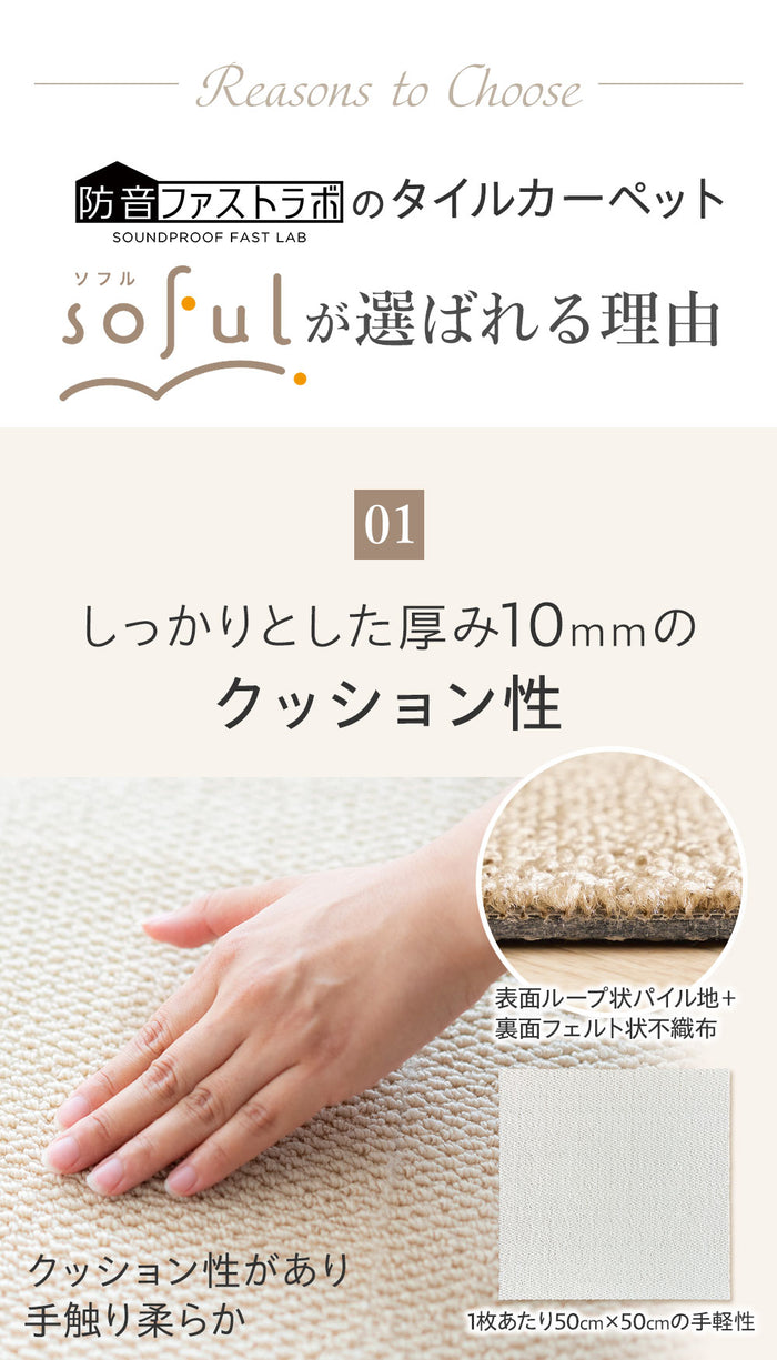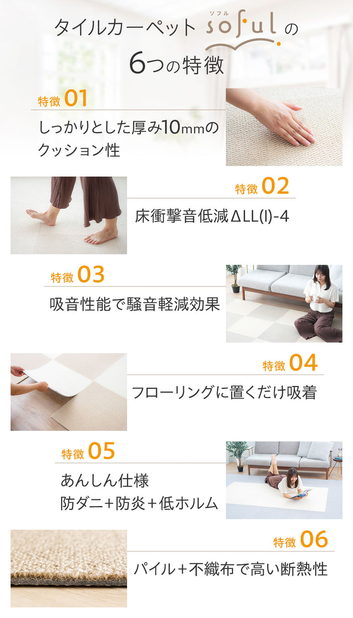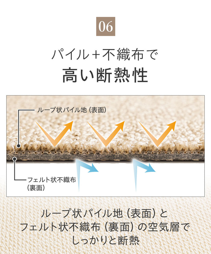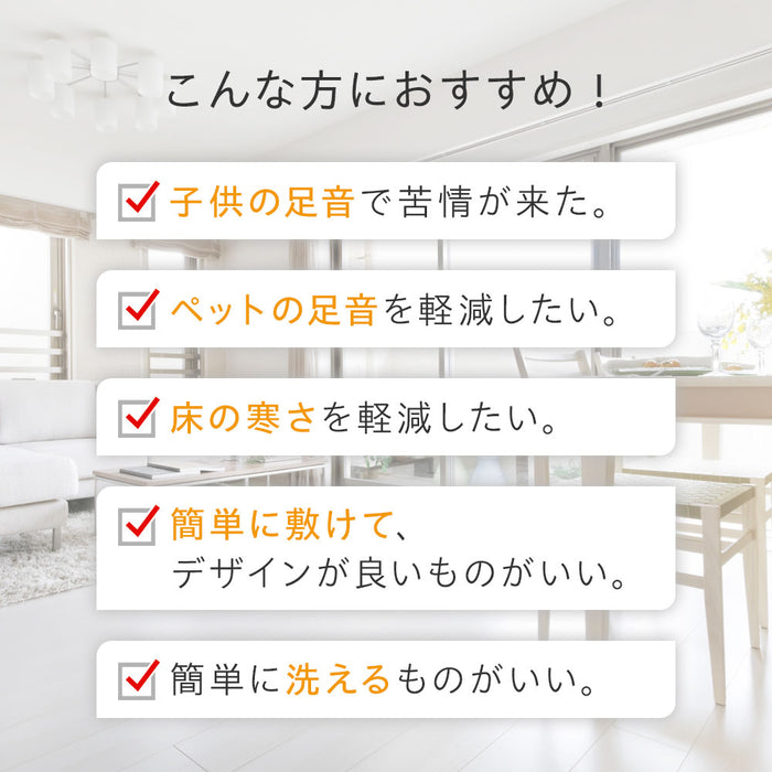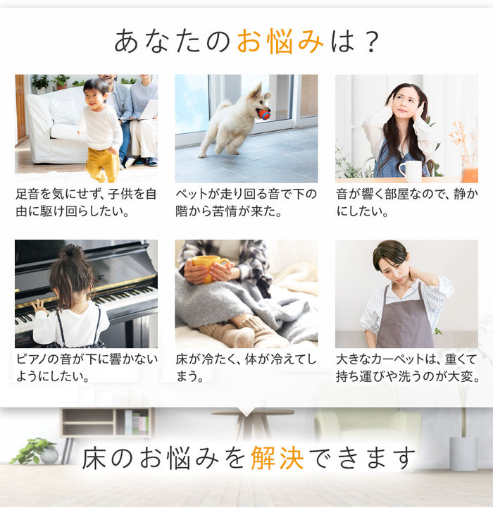 【 気にしていた生活音の軽減に 】 日々の暮らしの中で絶対に避けられないのが生活音。足音はもちろん、掃除をするときや趣味で楽器を弾いたり、健康のために体を動かしたりするときの音も気にしている床への騒音に耐衝撃性があるカーペットがあれば安心です。 【 お子さんやペットの騒音にも 】 子どもはおもちゃを投げたり落としたり、室内を駆け回ったり。または、ペットの出す音。鳴き声や室内を走り回る音も。そのたびに下の階への騒音の心配で不安。そのような悩みにも、下の階への騒音の軽減になり、さらにフロアの傷や汚れも防ぐことができます。" 【 日本製の優れた技術 】 日本製の確かな品質をお約束いたします。カットサイズ、カラー、毛足の長さなどの品質にムラがなく高クオリティ。イヤな臭いもなく、使い始めた直後から快適に過ごすことが出来ます。 【 豊富な9カラーバリエーション 】 床を覆うカーペットだからこそ色味は重要。豊富でデザイン性のあるカラーバリエーションにより、インテリアに合う空間にすることが出来ます。 【 軽量で簡単持ち運び 】 カーペットにありがちな、厚みやクッション性があるけど重くて持ち運びが難しい。。当店のカーペットは、厚みもクッション性もありながら、軽量なので設置や移動、片付けにも負担を感じることはありません。 【 ダニの心配無し 】 お洒落な空間を演出しながら、フロアを守るためにも何かカーペットがほしい。ただ、カーペットだとダニの心配が……という方でも、防ダニ加工でダニを寄せ付けないので安心です。 【 ズレの心配無し 】 せっかく場所を決めて敷物を置いても、気づいたらズレている……そんな経験はありませんか?裏面にはスベリ止め加工が採用されているので、置くだけでしっかりと吸着してくれます。 【 部分洗いでお手入れ簡単】 万が一汚れてしまったときには簡単に手洗い可能。50cm×50cmのタイルカーペットなので汚れた部分だけを取り外すことができ、手間も時間も大幅に節約できます。 【 通気性があり省エネ】 足元に置く敷物だからこそ、やはり湿気は気になるもの。裏面の基層がフェルト状の不織布で通気性があり、湿気がこもりにくい仕様になっています。床暖房やHOTカーペットにも対応しているので寒い時期でも安心です。 【 ご注意 】 ※製品の特性上、開封後、カットしたパイルの繊維くずなどが多く出る場合がございます。製品の品質上問題はありませんが、掃除機などで除去しながら施工いただきますようお願いいたします。 「塩化ビニール」また「ワックスのかかった床材」で、長期間使用されますと床面が変色する場合があります。こちらの素材の場合、月に一度位置をずらしたり、床面を乾拭きしたりしてください。 タイルカーペットの上に長期間重い物を乗せるますと、カーペットが剥がしにくくなりますので、ゆっくりと剥がしてください。 タイルカーペットを剥がした際、吸着面が床材に残った場合、ぞうきんで拭き取ってください。 畳、べニア板、モルタル、フェルトなどの素材には、吸着面が機能しませんので、別途、両面テープなどで接着が必要となります。 |