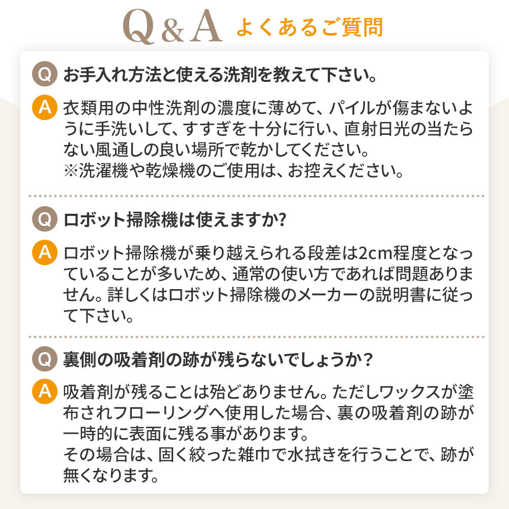 | 【 気にしていた生活音の軽減に 】 日々の暮らしの中で絶対に避けられないのが生活音。足音はもちろん、掃除をするときや趣味で楽器を弾いたり、健康のために体を動かしたりするときの音も気にしている床への騒音に耐衝撃性があるカーペットがあれば安心です。 【 お子さんやペットの騒音にも 】 子どもはおもちゃを投げたり落としたり、室内を駆け回ったり。または、ペットの出す音。鳴き声や室内を走り回る音も。そのたびに下の階への騒音の心配で不安。そのような悩みにも、下の階への騒音の軽減になり、さらにフロアの傷や汚れも防ぐことができます。" 【 日本製の優れた技術 】 日本製の確かな品質をお約束いたします。カットサイズ、カラー、毛足の長さなどの品質にムラがなく高クオリティ。イヤな臭いもなく、使い始めた直後から快適に過ごすことが出来ます。 【 豊富な9カラーバリエーション 】 床を覆うカーペットだからこそ色味は重要。豊富でデザイン性のあるカラーバリエーションにより、インテリアに合う空間にすることが出来ます。 【 軽量で簡単持ち運び 】 カーペットにありがちな、厚みやクッション性があるけど重くて持ち運びが難しい。。当店のカーペットは、厚みもクッション性もありながら、軽量なので設置や移動、片付けにも負担を感じることはありません。 【 ダニの心配無し 】 お洒落な空間を演出しながら、フロアを守るためにも何かカーペットがほしい。ただ、カーペットだとダニの心配が……という方でも、防ダニ加工でダニを寄せ付けないので安心です。 【 ズレの心配無し 】 せっかく場所を決めて敷物を置いても、気づいたらズレている……そんな経験はありませんか?裏面にはスベリ止め加工が採用されているので、置くだけでしっかりと吸着してくれます。 【 部分洗いでお手入れ簡単】 万が一汚れてしまったときには簡単に手洗い可能。50cm×50cmのタイルカーペットなので汚れた部分だけを取り外すことができ、手間も時間も大幅に節約できます。 【 通気性があり省エネ】 足元に置く敷物だからこそ、やはり湿気は気になるもの。裏面の基層がフェルト状の不織布で通気性があり、湿気がこもりにくい仕様になっています。床暖房やHOTカーペットにも対応しているので寒い時期でも安心です。 【 ご注意 】 ※製品の特性上、開封後、カットしたパイルの繊維くずなどが多く出る場合がございます。製品の品質上問題はありませんが、掃除機などで除去しながら施工いただきますようお願いいたします。 「塩化ビニール」また「ワックスのかかった床材」で、長期間使用されますと床面が変色する場合があります。こちらの素材の場合、月に一度位置をずらしたり、床面を乾拭きしたりしてください。 タイルカーペットの上に長期間重い物を乗せるますと、カーペットが剥がしにくくなりますので、ゆっくりと剥がしてください。 タイルカーペットを剥がした際、吸着面が床材に残った場合、ぞうきんで拭き取ってください。 畳、べニア板、モルタル、フェルトなどの素材には、吸着面が機能しませんので、別途、両面テープなどで接着が必要となります。 |