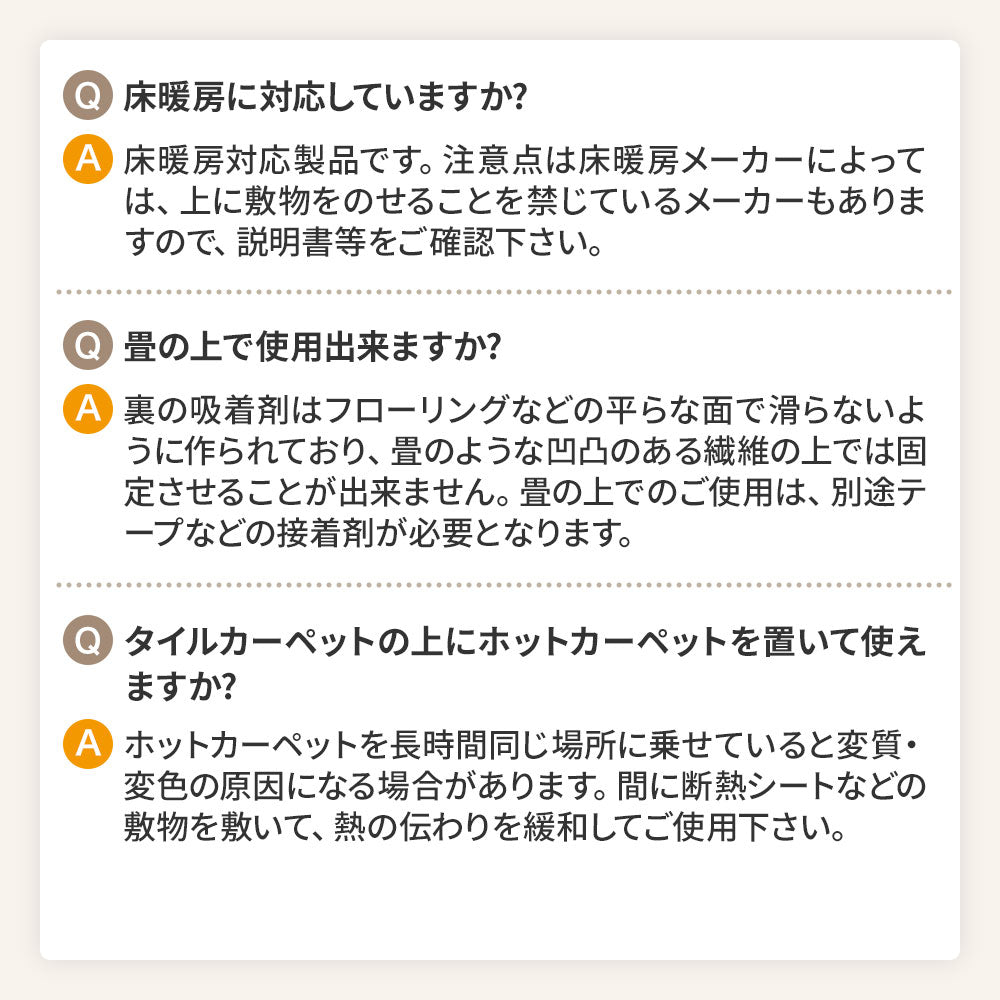 | 床暖 | 床暖房のフローリングの上にも置敷き可能な商品です。 |